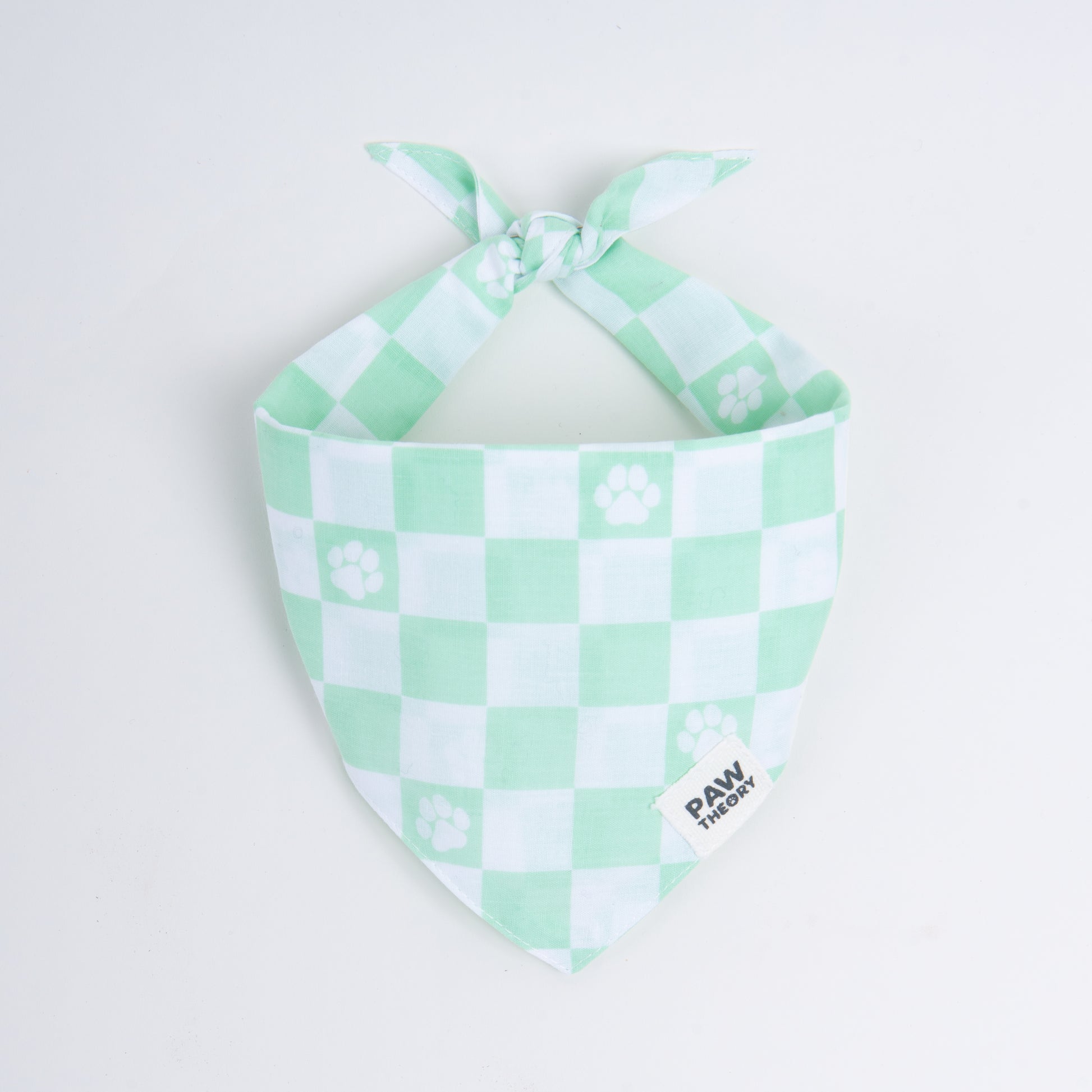 Add a touch of playful charm to your pup's daily walks with our Sage Green Checkered Dog Bandana. Thoughtfully handmade from 100% cotton and finished with a subtle paw print design. This triangle bandana is tailor cut and double-sided. Soft, breathable, and lightweight, this bandana pairs perfectly with all coat colors.